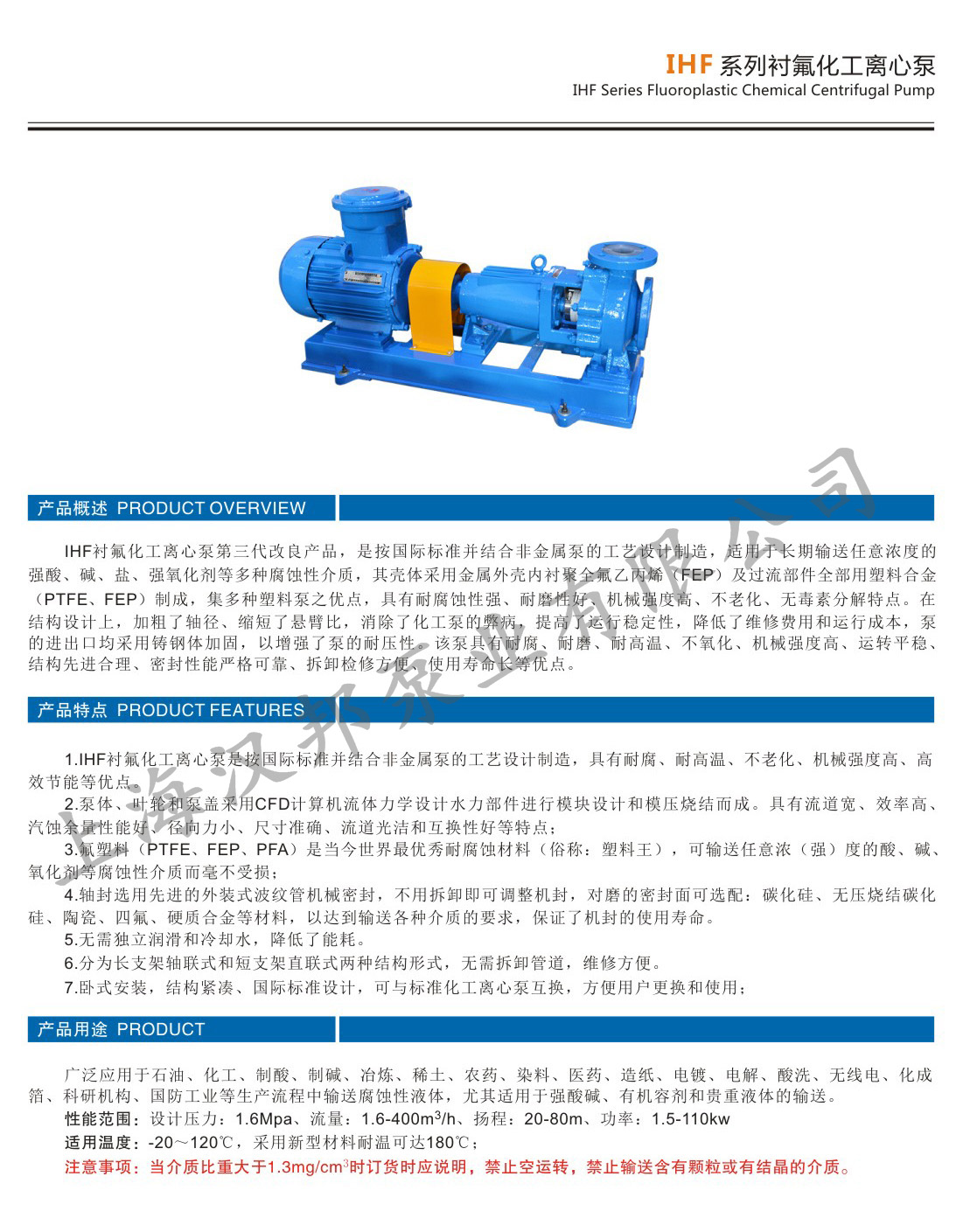 IHF型氟塑料合金化工泵具有耐腐、耐磨、耐高溫、不老化、機(jī)械強(qiáng)度高、運(yùn)轉(zhuǎn)平穩(wěn)、結(jié)構(gòu)先進(jìn)合理、密封性能嚴(yán)格可靠、拆卸檢修方便、使用壽命長(zhǎng)等優(yōu)點(diǎn),廣泛適用于化工、制藥、石油、冶金、冶煉、電力、電鍍、染料、農(nóng)藥、造紙、食品、紡織等行業(yè),在-85℃~200℃溫度條件下長(zhǎng)期輸送任意濃度的硫酸、鹽酸、氫氟酸、硝酸、王水、強(qiáng)堿、強(qiáng)氧化劑、有機(jī)溶劑、還原劑等強(qiáng)腐蝕介質(zhì),是目前世界是zui耐腐蝕設(shè)備之一。